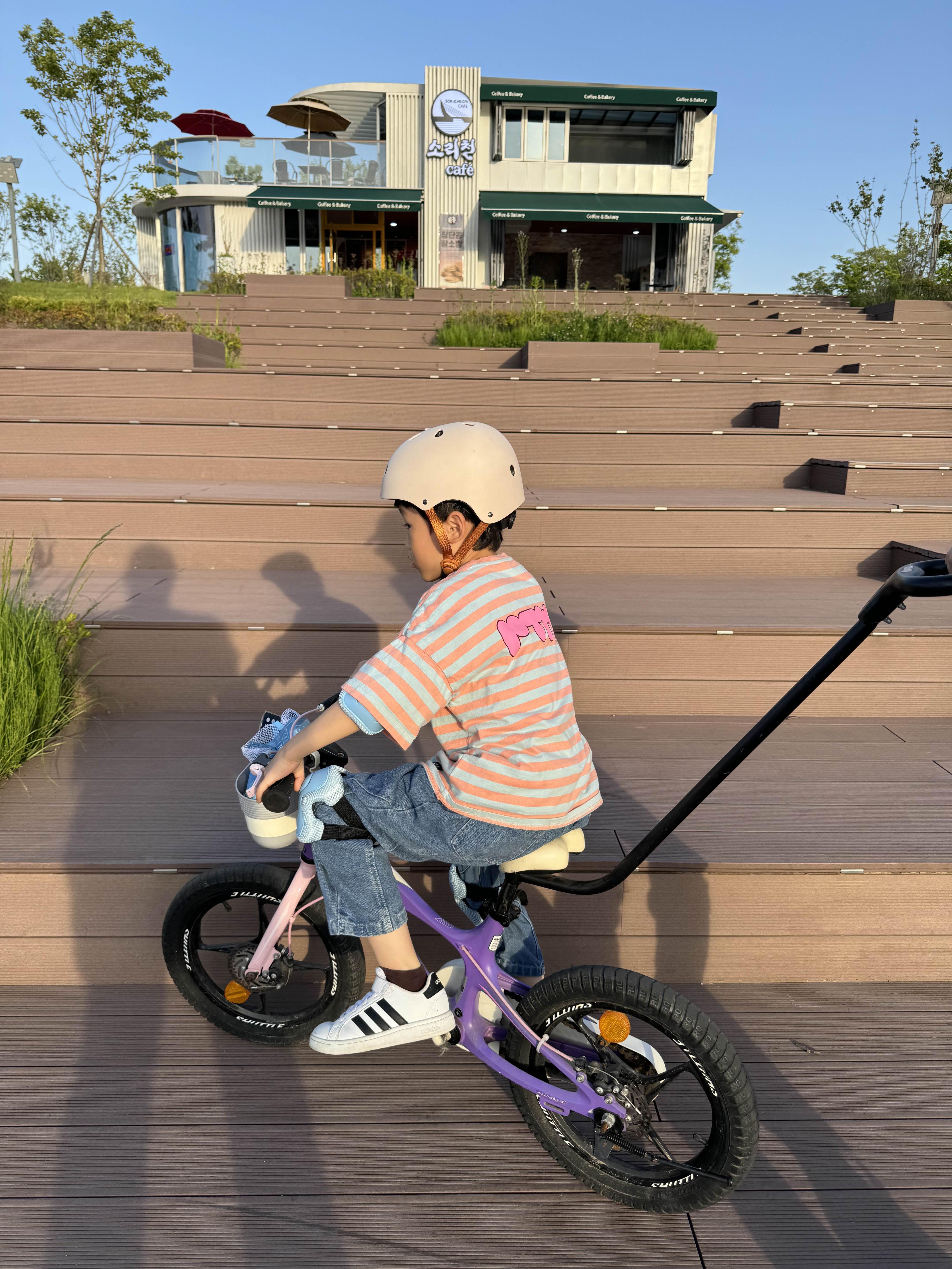 그 때마다 ‘땅을 보지 말고 앞을 봐야해~’, ‘넘어질 것 같으면 더 속도를 높혀봐~' 등등 필자는 숨을 헐떡거리며 소리를 질렀다. 결국 밀대 덕분인지, 아빠의 헐떡거림 덕분인지 한 달도 안되어 아들은 자전거를 어느 정도 타게 되었다.