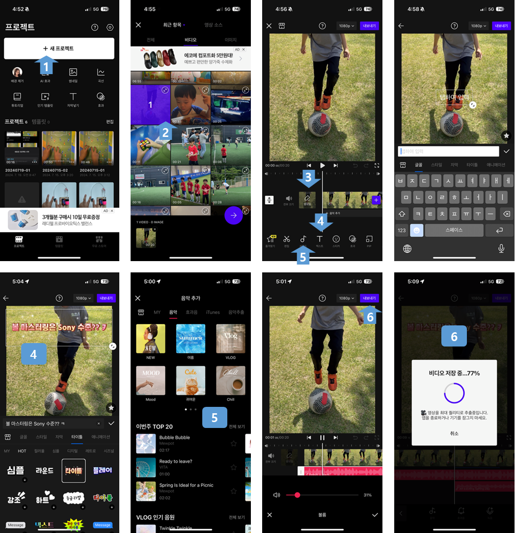 - 썸네일 눌러 편집 시작 (템플릿 적용, 꾸미기 등 다양한 기능이 있으나 썸네일 텍스트와 음악 삽입만으로 충분)