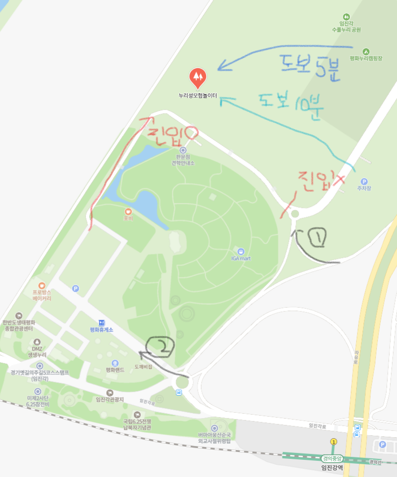 - 평화누리캠핌장 근처 무료 주차장(1번) : 놀이터까지 차량 진입 불가(캠핑장 이용객 차량진입 가능), 도로 10분