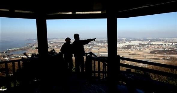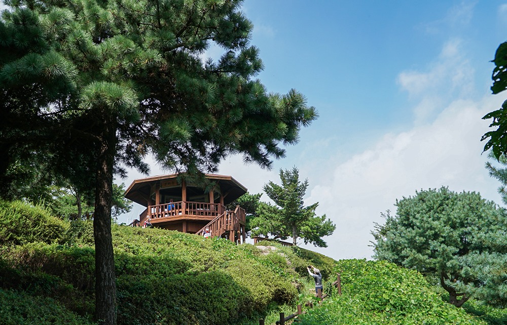 정상에 오르면 팔각정이 있는데 한강과 자유로, 멀리 인천 앞바다까지 탁트인 전망을 즐길 수 있다.