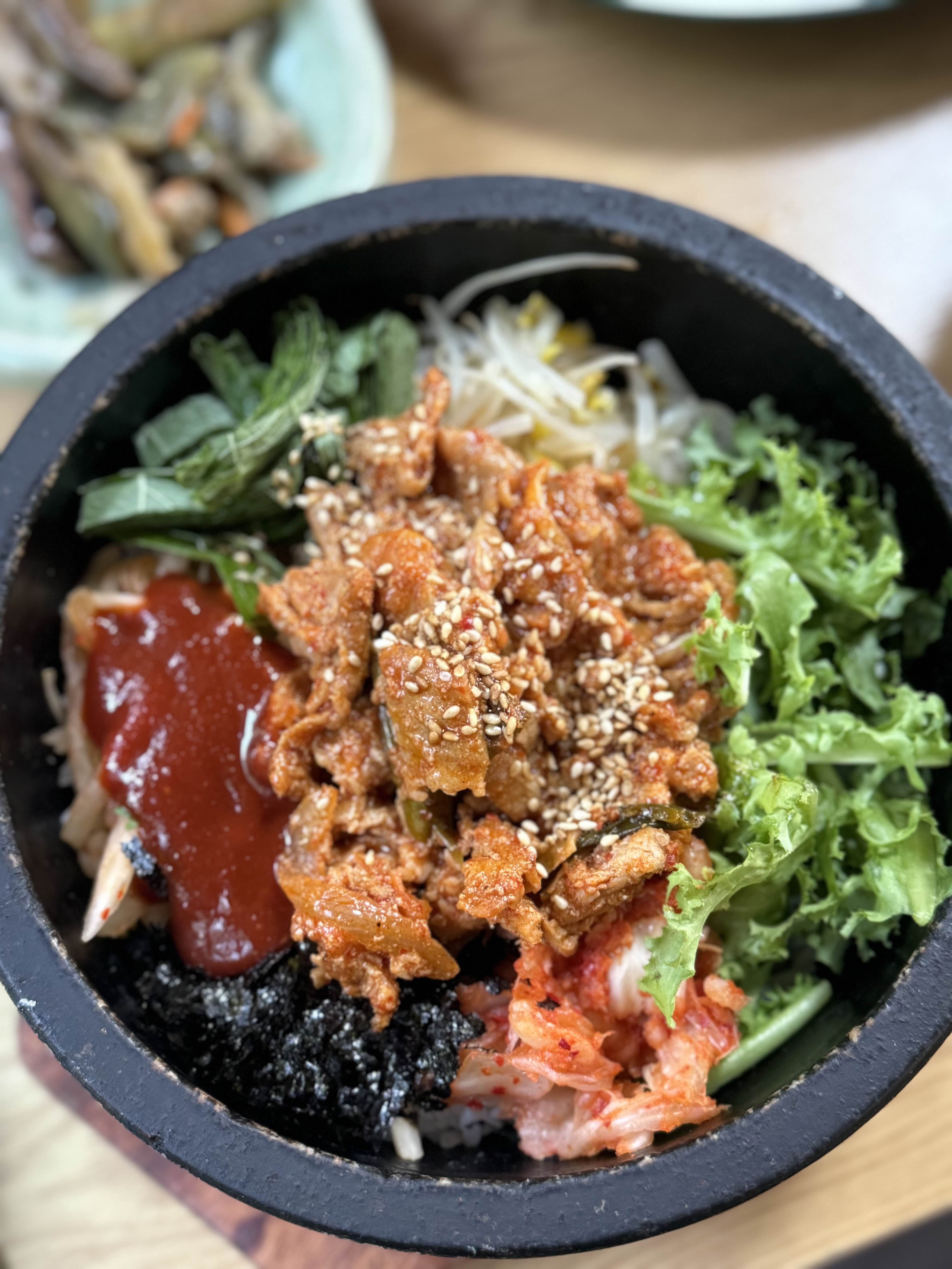 나는 야채만 먹기 좀 그래서 제육볶음이 올라간 비빔밥을 선택했는데, 동동주와도 잘 어울리고 고기가 꼭 있어야 하는 사람에게 잘 맞을 것 같다.