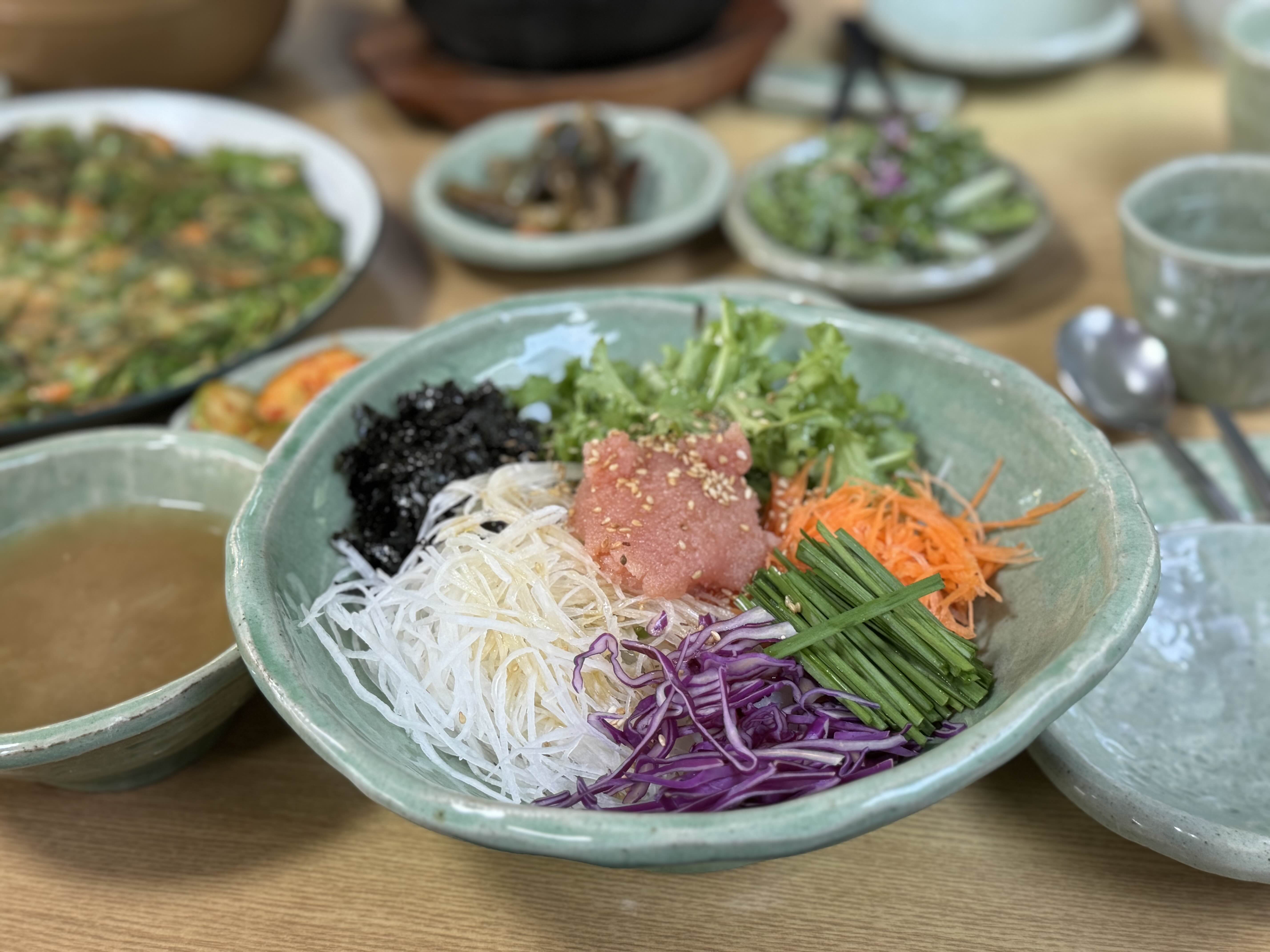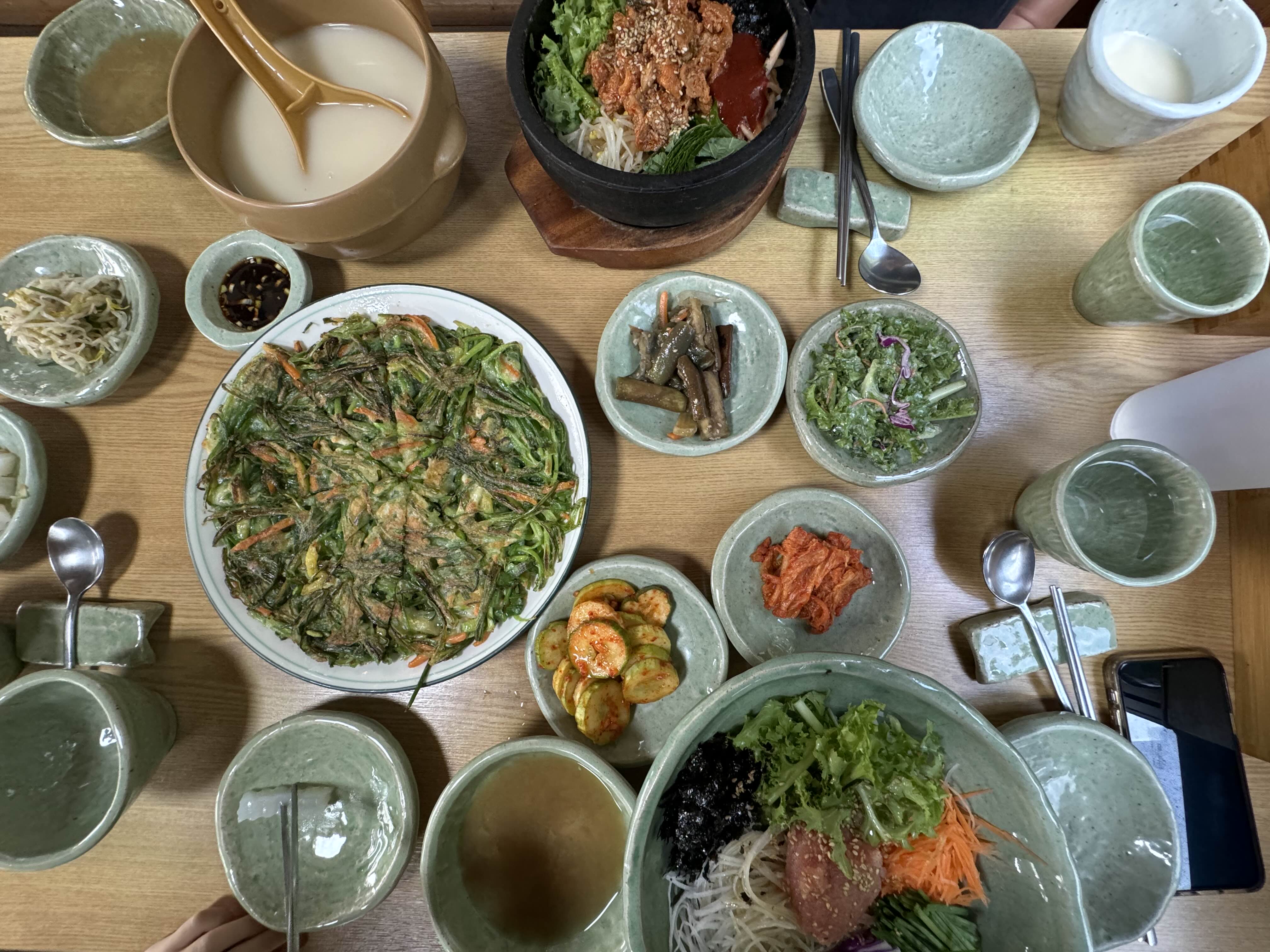 나물 위주의 반찬은 푸짐하고 정갈하다. 이 날 우리는 돌솥 제육 비빔밥, 명란 비빔밥, 부추야채전, 그리고 동동주를 먹었다.