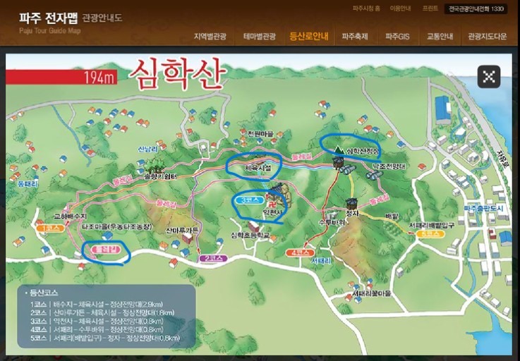 교하읍에 위치한 심학산은 고도 194m로 낮은 산이지만 아기자기한 등반코스를 부담없이 오를 수 있어 주민들의 사랑을 받는다. 모든 코스가 지상에서 1시간 30분 안에 정상에 오를 수 있다.