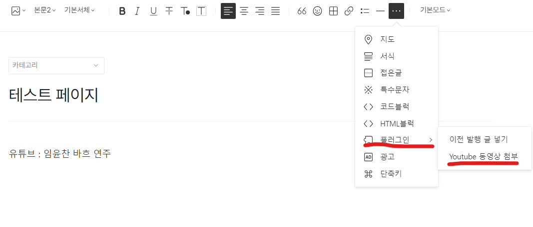 이제 글 작성 화면에서 상단 ‘더보기(점 세개)’ 메뉴에 들어가면 플러그인으로 Youtube 동영상 첨부 기능을 사용할 수 있다.