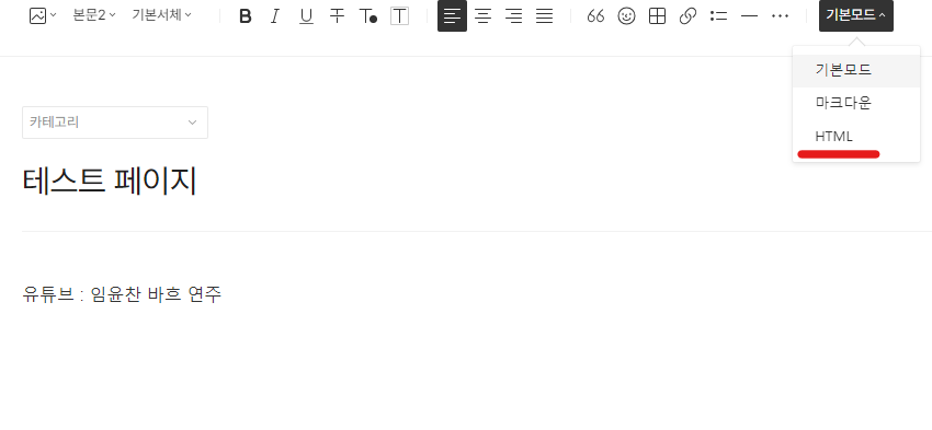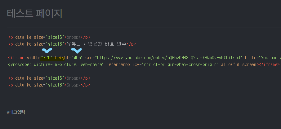 다시 티스토리 작성 글에 들어가서 상단 메뉴의 작성모드를 HTML로 변경한 후 코드 입력 창 영상 제목 아래에 복사해둔 코드를 붙여넣기 한다.