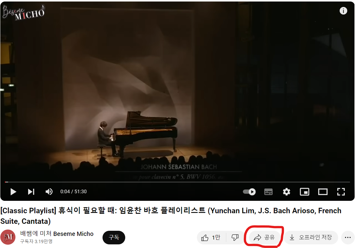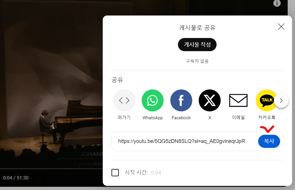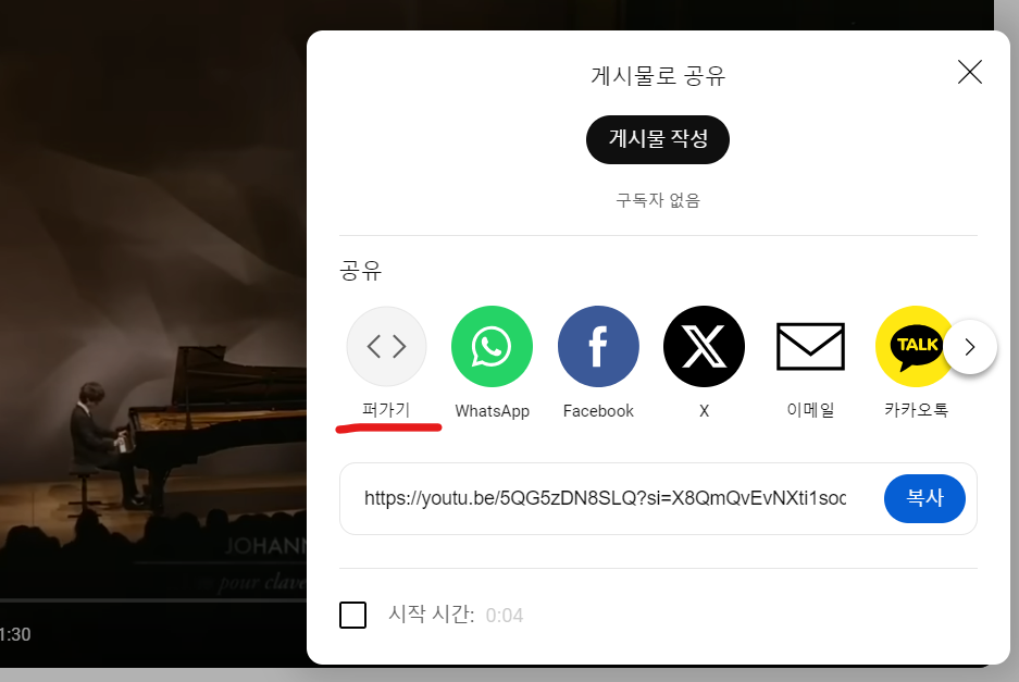 먼저 유튜브 사이트에 들어가 연결할 영상을 검색하고 영상 하단 ‘공유’를 클릭하면 아래와 같은 팝업이 뜨고 여기서 주소를 복사해 둔다.